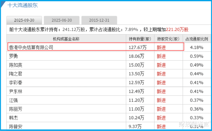 更引人注目的是,“香港中央结算有限公司”这个名字,在三季度新出现在前十大流通股东名单中。